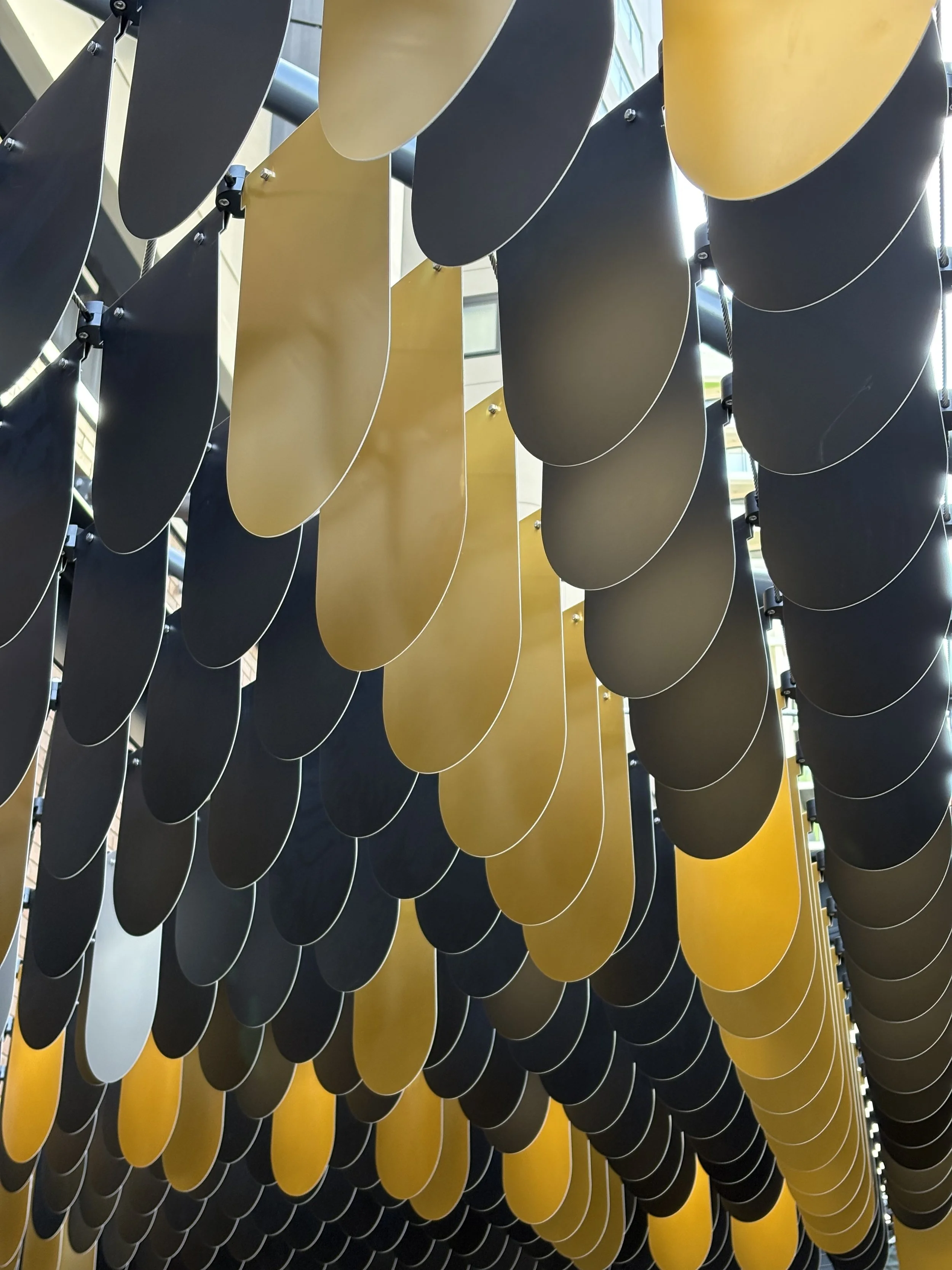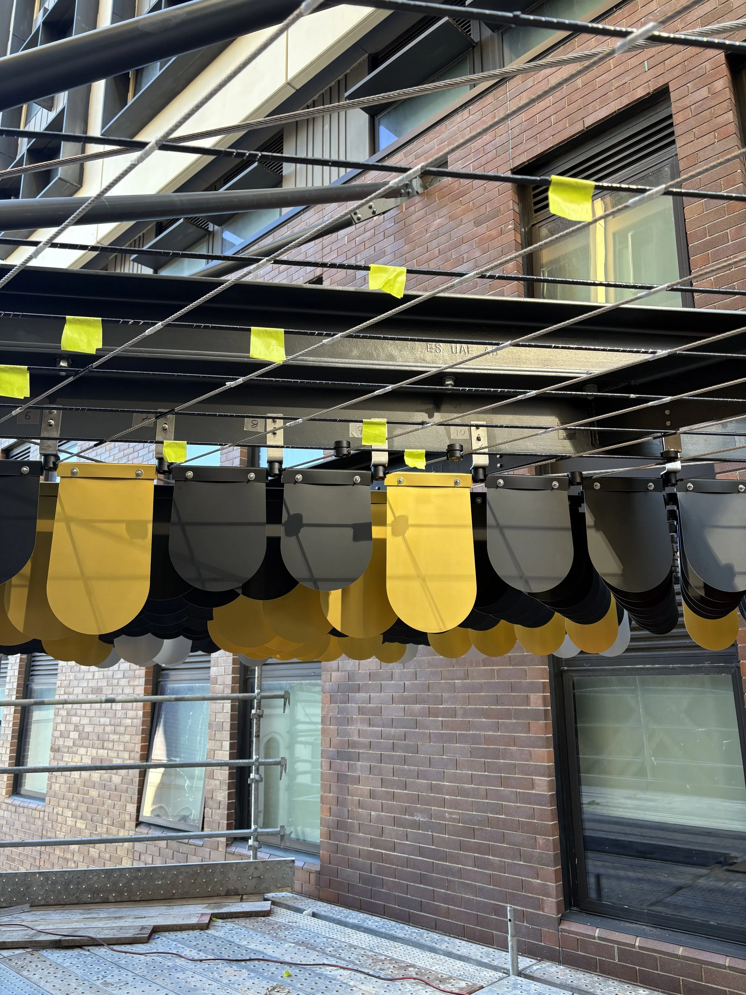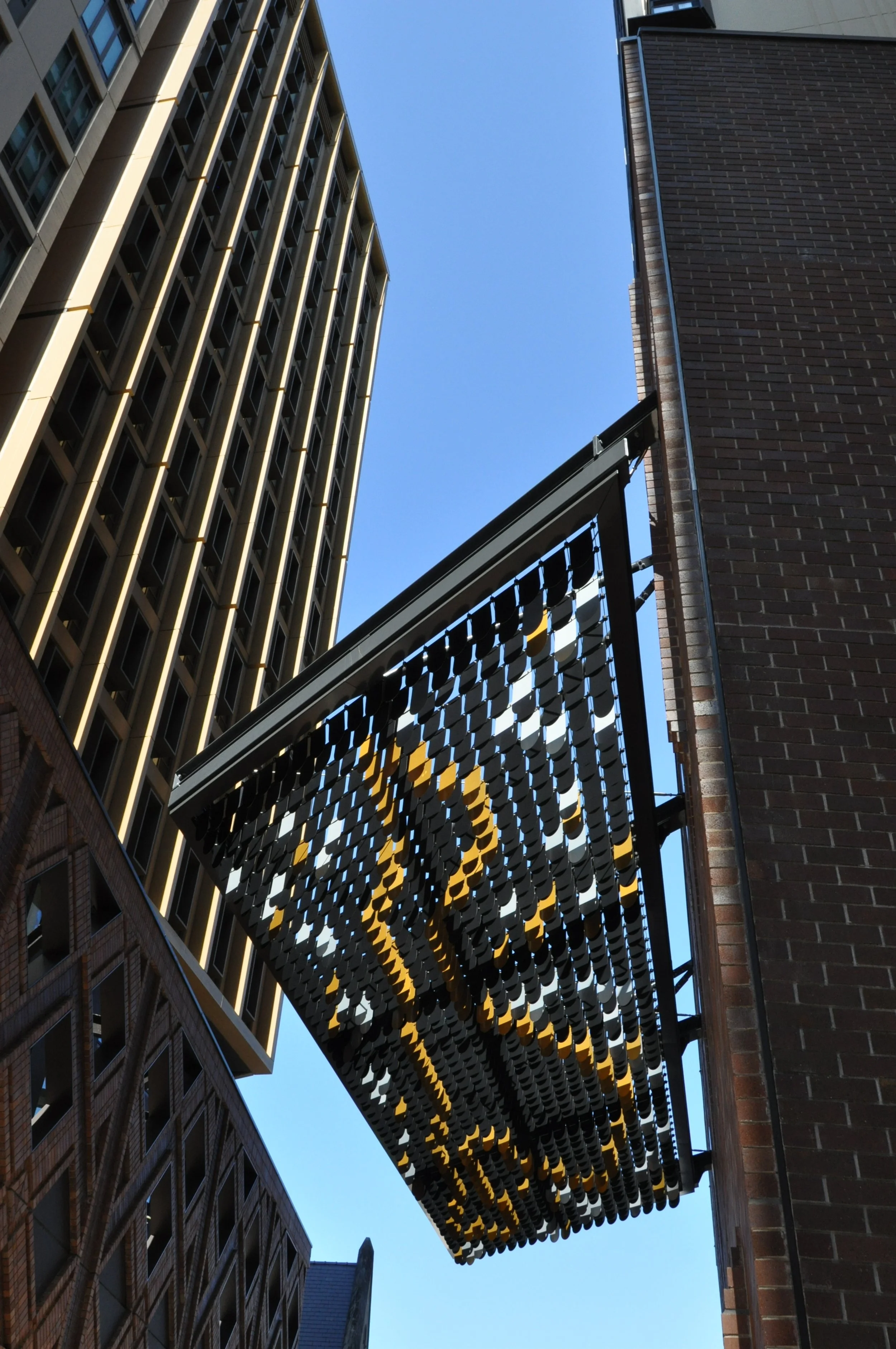 The artwork comprises a 17m x 5m trapezoidal steel frame in a small Redfern lane 9m above the ground. Made up of a pre tensioned stainless steel wire grid locked in position with custom button clamps, 1200 fixed and dynamic aluminium panels in gold, silver and black and framed by a custom aluminium trim creating a picture frame effect.